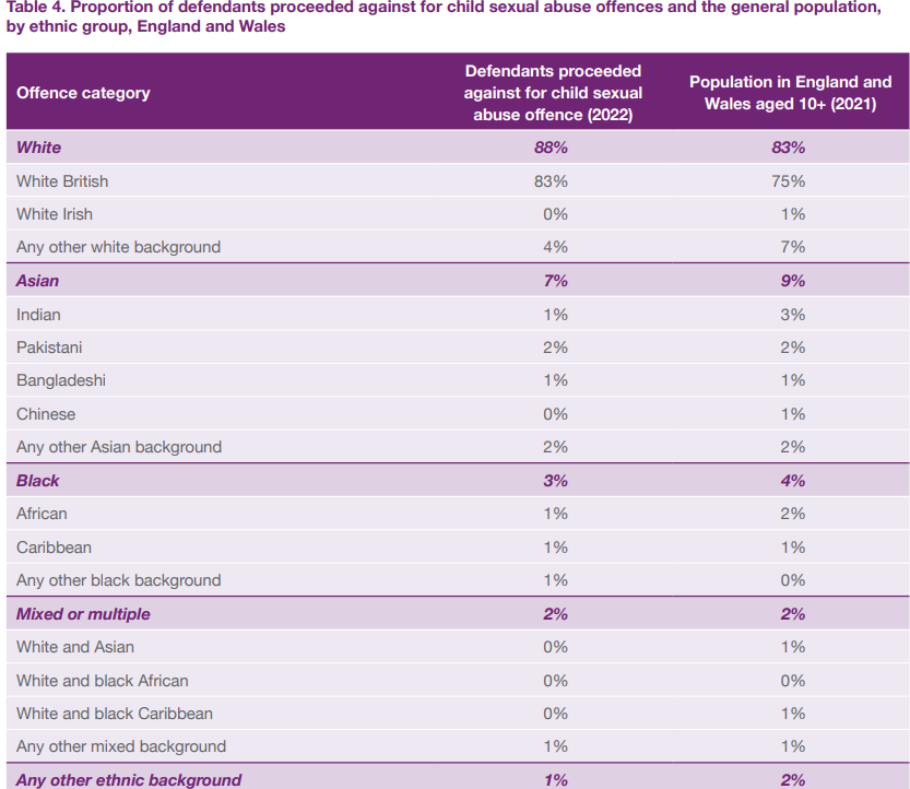 The report acknowledges difficulties in identifying sexual abuse among non-white communities. Suggesting the ethnic breakdown is representative of many offences going unreported.